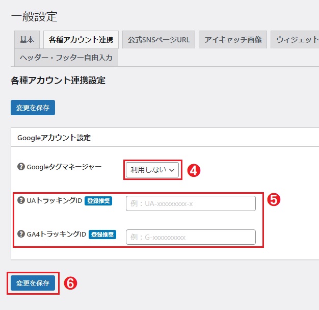 「利用しない」を選択すると、アナリティクスのID入力エリア(下記画像・赤枠内❺)が表示されます。