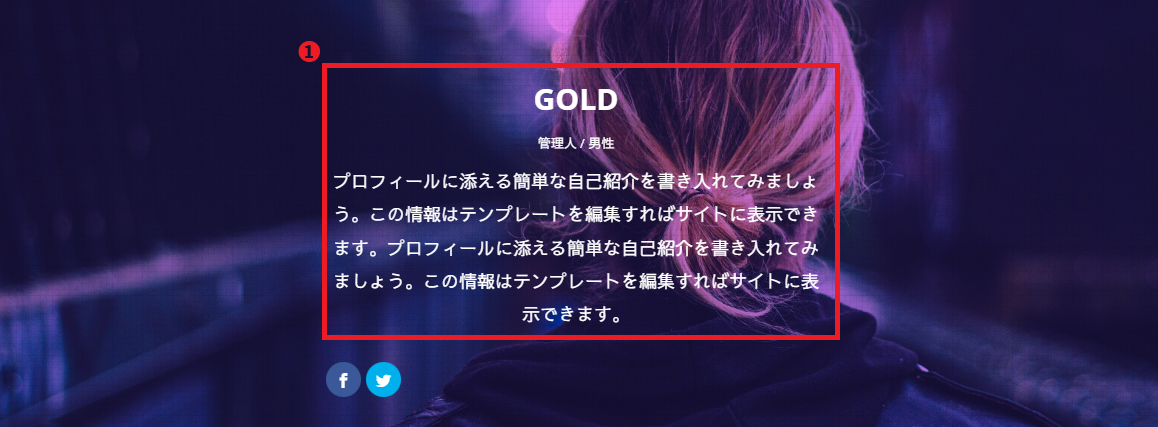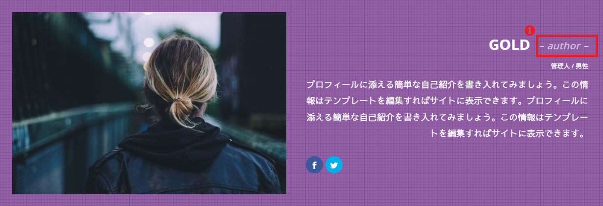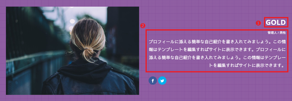 下記サンプル画像➀(❷赤枠内)に表示されている「管理人/男性」以下のテキストが、サブタイトルの表示個所です。