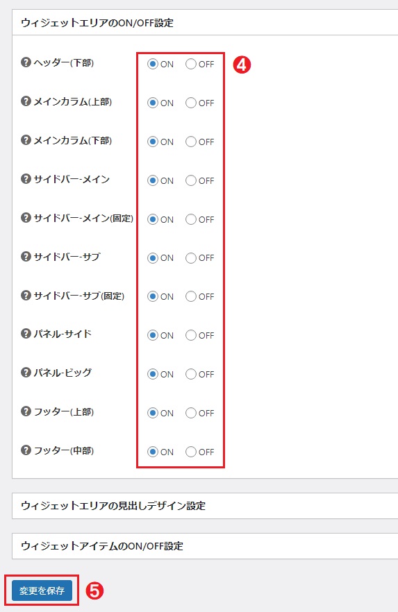次に、「ウィジェットエリアのON/OFF設定」❹で、非表示にしたいウィジェットの「OFF」にチェックを入れます。