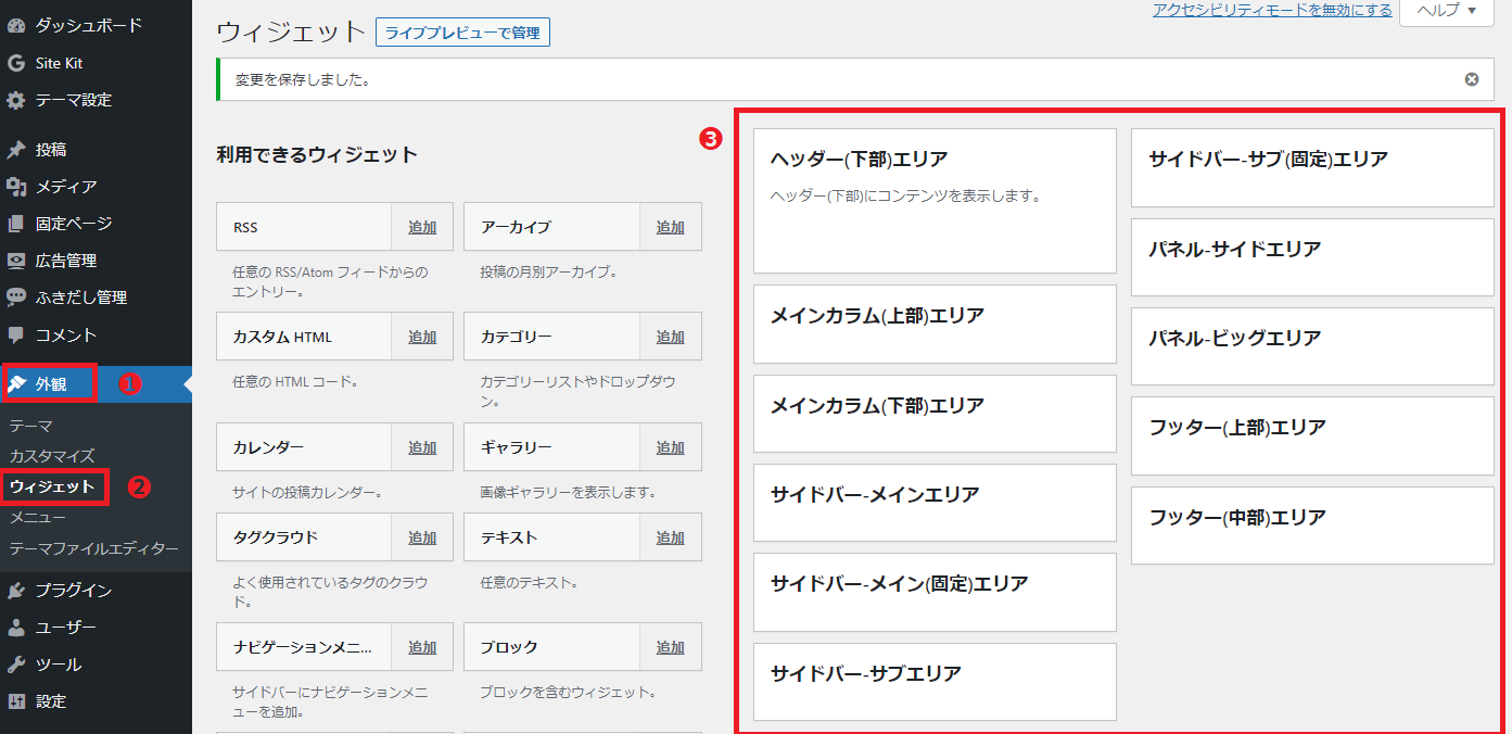 - 「外観」→「ウィジェット」で表示されるウィジェットエリアの一覧(上記画像・❸赤枠内)から削除されると同時に